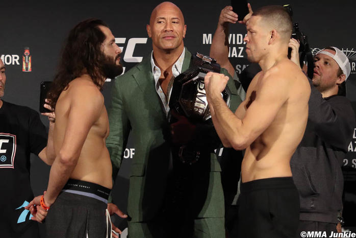 摔角网讯,北京时间2019年11月2日进行的UFC244新闻发布会前,前WWE巨星,好莱坞巨星巨石强森携头号恶棍头衔出席了称重仪式!或许不少网友在好奇,为何巨石强森会对UFC产生如此浓厚的兴趣呢!
