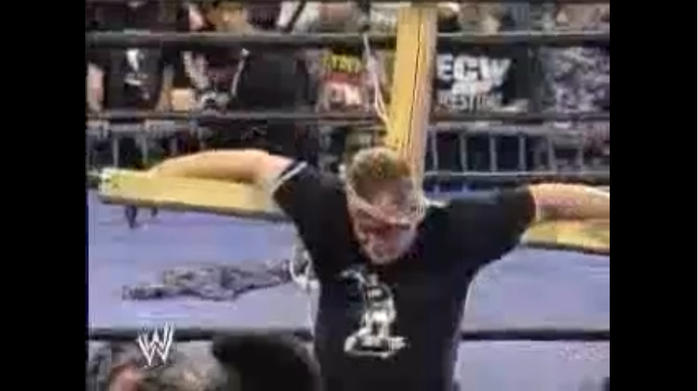 其中最为争议的就是保罗·海曼安排拉文(Raven)将萨德曼绑在十字架上,将其悬挂在擂台边绳位置!而这一幕在当时的观众席中,就传来了不少的嘘声!