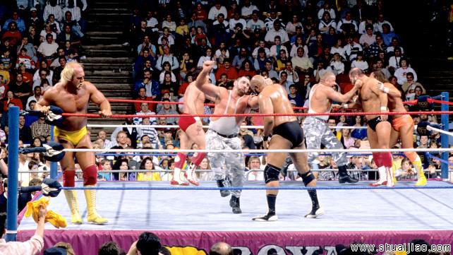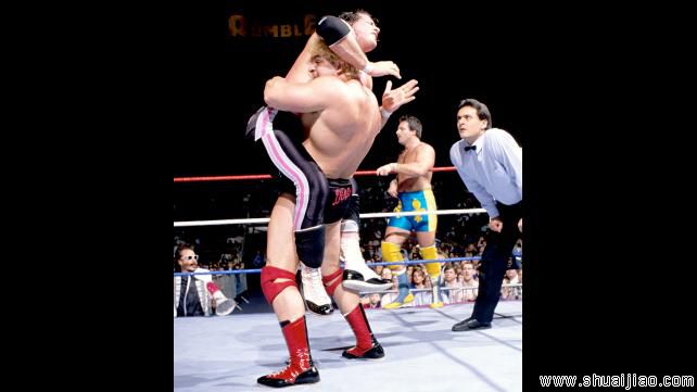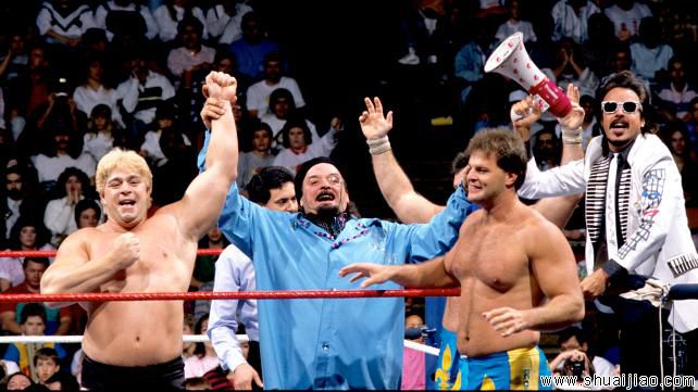 Jim Duggan & The Hart Foundation (Bret Hart & Jim Neidhart) 战胜 Dino Bravo & The Fabulous Rougeaus (Jacques Rougeau & Raymond Rougeau) (w/Frenchy Martin & Jimmy Hart) [2:1] (17:54)